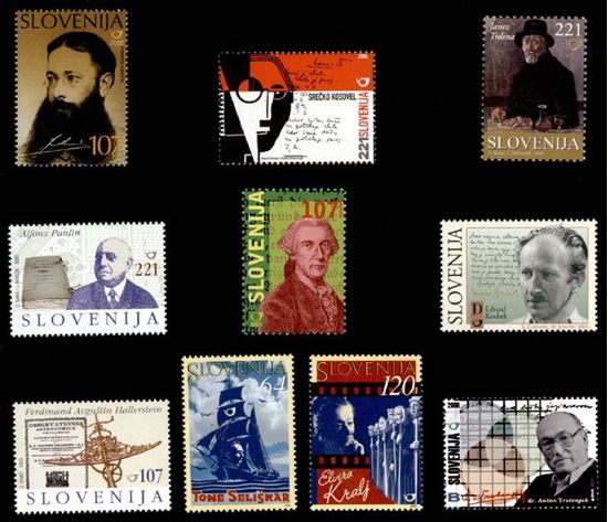 The set contains 10 special stamps from the Prominent Slovenes series issued between 2000 and 2006 (excluding 2001).